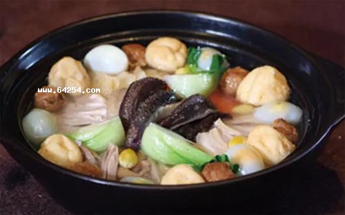 鄭州伊府面,因用全蛋和面,配以海參、猴頭、尤魚、蹄筋、玉蘭片、海米、熟雞絲、鮮菇、木耳,并佐以適量味精、天油、胡椒、辣椒油等,用砂鍋下面,在風(fēng)味上自成一格,為廣大顧客和行家所稱道。
