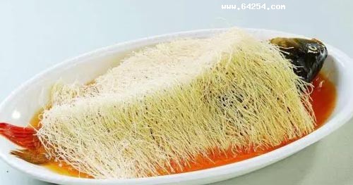 當(dāng)時這種面只用水煮,取其柔軟筋香的風(fēng)味。以后改為焙制方法,用油炸之使其酥脆吸汁,和菜肴汁水同食,故稱“陪面”,也叫“扛面。一九三0年前后,河南名廚蘇永秀,采用薄如紙的餛飩皮,切成細(xì)絲,用油炸成色澤金黃,蓬松脆香的“龍須面”,蓋在做好的“糖醋溜魚上面,客人既可食魚,又可以面蘸汁同餐,別有風(fēng)味,逐漸傳開。