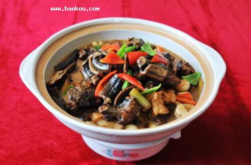 商城縣河渠縱橫,庫、塘、堰、壩密布,有利于黃鱔自然生長繁殖。以商城黑豬臘肉和野生鱔魚為原料,烹制的臘肉鱔魚火鍋,臘肉濃香,鱔魚嫩鮮,風(fēng)味獨(dú)特,回味無窮,具有補(bǔ)血、補(bǔ)氣、消炎、消毒、除風(fēng)濕等功效。