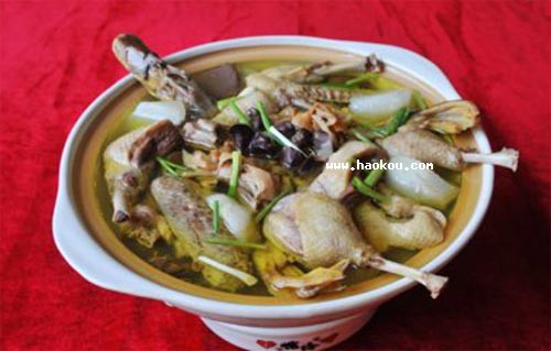 主料是養(yǎng)鴨戶用稻谷、雜糧作飼料,散放飼養(yǎng)的生長期一年以上的淮南麻鴨。以鴨肉、鴨雜、鴨血和當(dāng)?shù)厣教}卜為原料,添加當(dāng)?shù)厣饺�,采用�?dāng)?shù)貍鹘y(tǒng)廚藝烹制而成的鴨湯,營養(yǎng)豐富,肉質(zhì)酥嫩,鴨血爽滑、湯清味鮮,蘿卜清香,甘甜爽口,風(fēng)味獨(dú)特,令人常食不膩。以能清火解毒、滋補(bǔ)去濕、養(yǎng)胃補(bǔ)腎、除痰健肺,錄入古籍藥典《名醫(yī)別錄》,被稱為“妙藥”和滋補(bǔ)上品。