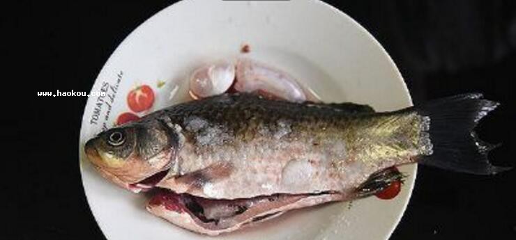 1、鯽魚去鱗、去腸雜、留魚籽,在魚身兩面各斜劃二刀,洗干凈后抹鹽腌10分鐘。