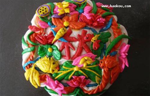 特點(diǎn):整個(gè)花糕形似山丘,從頂?shù)降着t著綠,有花有鳥(niǎo),形態(tài)可愛(ài)。重陽(yáng)親友間互贈(zèng)花糕,寓意五谷豐登;花糕上的蛇、蜘蛛、蛤蟆等則表示對(duì)五毒的降服,意在驅(qū)除病害祈求安康;花朵意在祝福親友全家歡樂(lè),幸福美滿(mǎn)。