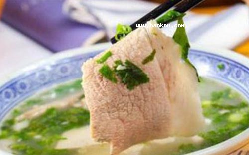 制法:將豬五花肋條肉用清水漂洗干凈;豬肥腸(直腸)先用涼水將內(nèi)外沖洗一次,再翻過來用粗鹽和玉米面粉通過摘、翻、按、捋等工序三次反復(fù)揉搓,達(dá)到去除污、腥、臊、膩的效果(為防止腸子發(fā)黃、發(fā)紅和味道變苦,忌用堿洗);對(duì)新鮮和冷凍的魷魚,用清水洗凈,去掉上面一層薄膜,除去腹部軟骨。對(duì)干魷魚,先用清水漂洗干凈,再進(jìn)行漲發(fā),除去薄膜和軟骨;將雞去毛、去內(nèi)臟,洗凈晾干。在鍋內(nèi)添入清水,投入上述處理好的原輔料,加入料酒、生姜,用旺火燒開,撇去浮沫,改用微火燉煮(適時(shí)先撈出魷魚),直到肉爛為止。撈出雞、豬肉、肥腸后,趁熱去掉肉皮,盛于器皿內(nèi)盤成半圓形。留燉肉的原汁湯備用。(3)食客不掰饃,不泡饃。由廚師按碗“單做”,始終保持鍋內(nèi)原汁湯的潔凈和鮮美,每碗放入經(jīng)用斜刀法片成的各種肉料、魷魚片,加入水發(fā)粉絲、蔥花、香菜、熟豬油、味精和用多種調(diào)料熬制的調(diào)料水,最后澆入適量的原汁湯。還備有油潑辣子,以便食性喜辣的食客隨意調(diào)用。主食是用三扇鏊現(xiàn)制的熱薄鍋盔或熱燒餅。由食客掰開干薄香脆的熱饃,夾上晶瑩透亮的肉片,品一口香醇的鮮湯,佐以清脆爽口的泡菜,別有情趣。