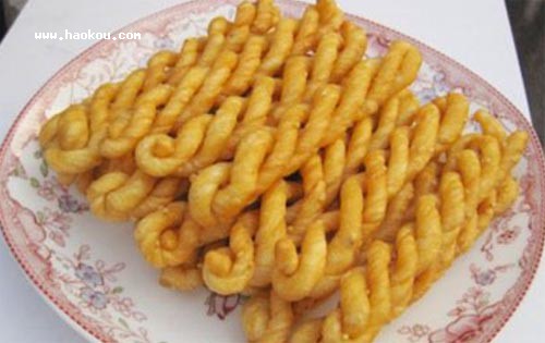 制法:精鹽、堿面用水化開,加雞蛋攪拌均勻后放入面粉,攪拌揉搓成軟硬適度的面團,餳發(fā)1小時后,將面團揪成等量面劑,并逐一搓成細長條,捏住兩端上勁,再將兩端相并,放開使其自然上勁成環(huán)狀互扭形,即成麻花坯。若制甜的,和面時不用精鹽,改為白糖即可。鍋內(nèi)添入菜籽油加熱,將麻花坯放入炸制,待色呈棕黃色撈出瀝油即成。咸麻花與甜麻花應(yīng)分別炸制。