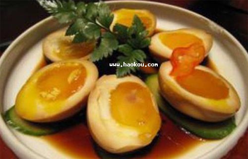 制法:選取新鮮雞蛋放入涼水鍋里,燒沸,煮三四分鐘,將雞蛋撈出,放入清水中。煮蛋要掌握好時間,不可老,也不可太嫩,要使蛋黃外面凝固,黃心呈粥樣狀。將煮好的雞蛋放在小缸里,加入開水和精鹽,開水以沒過雞蛋為宜,再放入些花椒。水冷后倒入一杯大曲白酒,使鹵有酒香味。放入的蛋可輕輕敲破,但外殼要保持完整,要將蓋封嚴,捂上六七天即成。