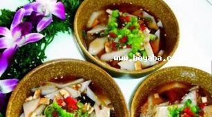 碗托由精制蕎麥制作成碗狀,放入鍋中蒸熟,然后取出等待涼了以后,切成片壯,可以炒熱食用,但是如果涼吃以豬肝等為拌料后味道鮮美可口,很有韌性。