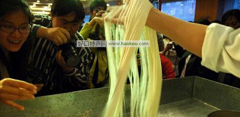 - —把和的很軟的面放在一個帶把面板上,一手端面板,一手用鐵制筷子或木筷子一根一根往下?lián)苋脲亙?nèi),如小魚在水里跳躍。這種面柔軟